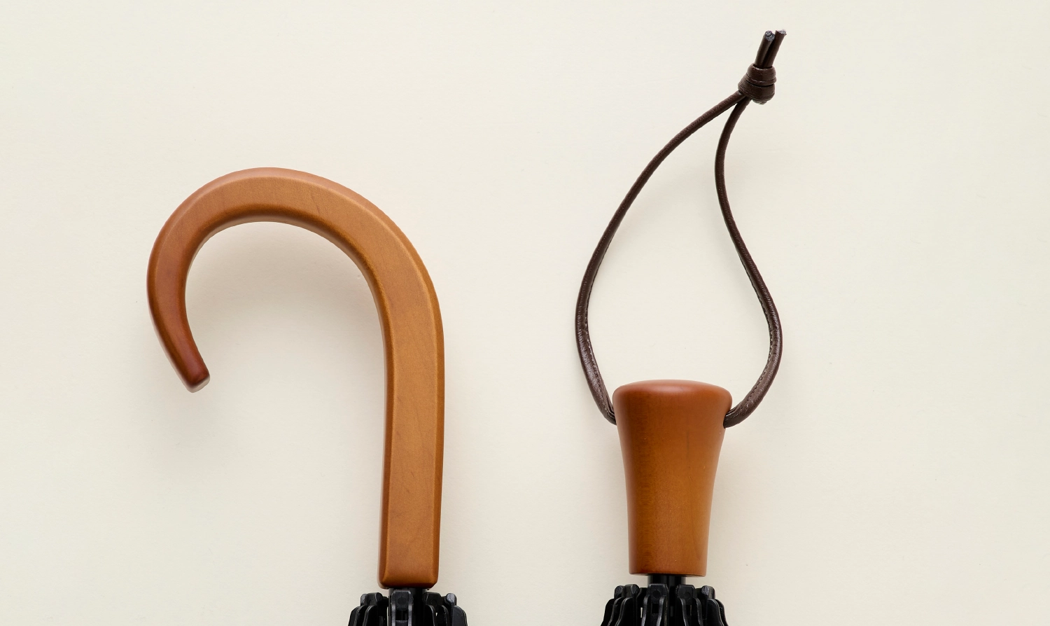 手元は天然木のため、ひとつひとつ風合いが異なりますのでご了承下さい。サンバリアオリジナルデザインの「木曲がり手元」と「木ストレート手元」の2種類からお選びいただけます。