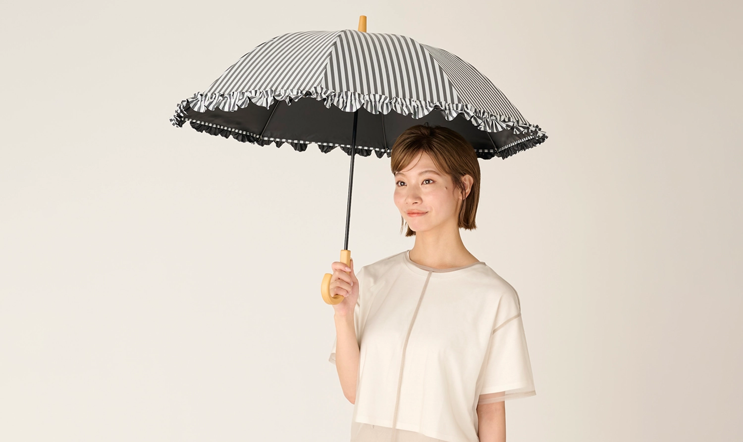 紫外線100%カット、赤外線100%カット、可視光線100%カットの完全遮光日傘です。サンバリア100の中では傘のサイズが一番小ぶりです。白と黒のモノトーンストライプは、上品な服装にはもちろん、カジュアルな服装にもマッチします。