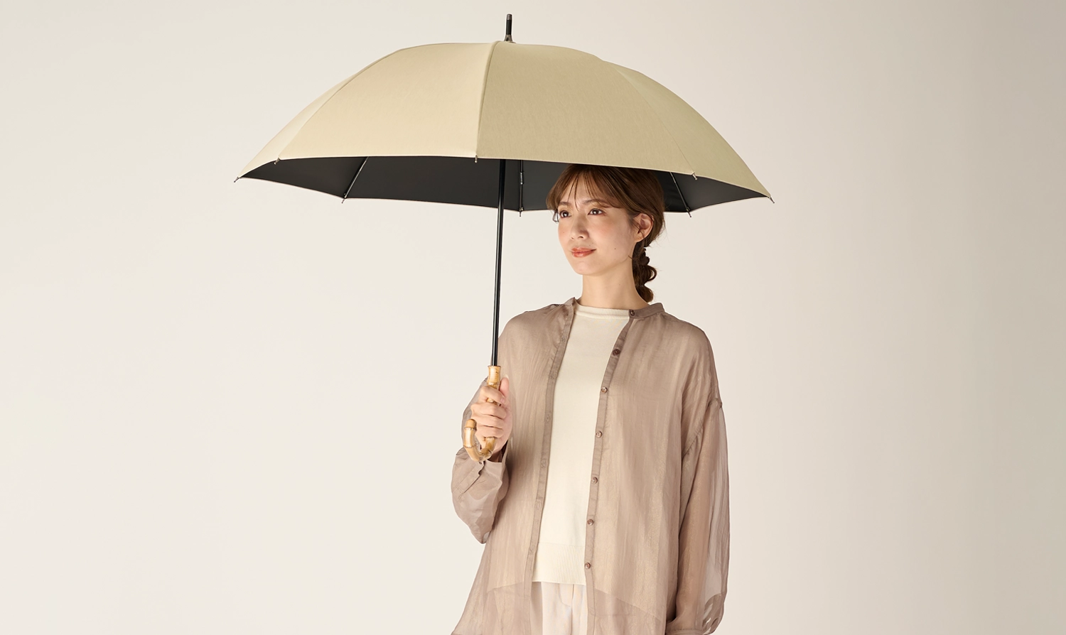 傘の裏側は黒のポリウレタンフィルムラミネート。黒は散乱光、照り返しの紫外線・赤外線も吸収し、まぶしくなく、目にとても優しいです。涼しさも違います。
