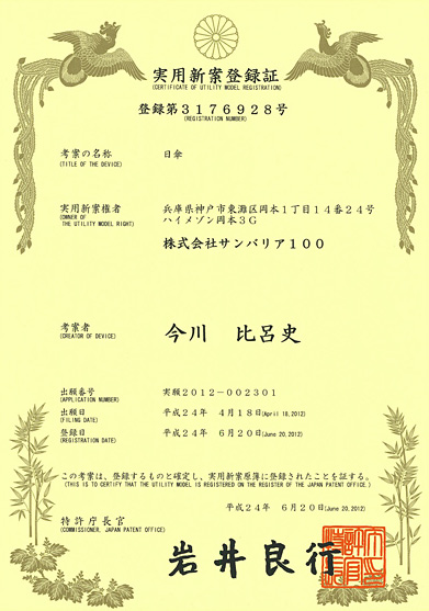 平成24年6月にサンバリア100が実用新案に登録されました。
