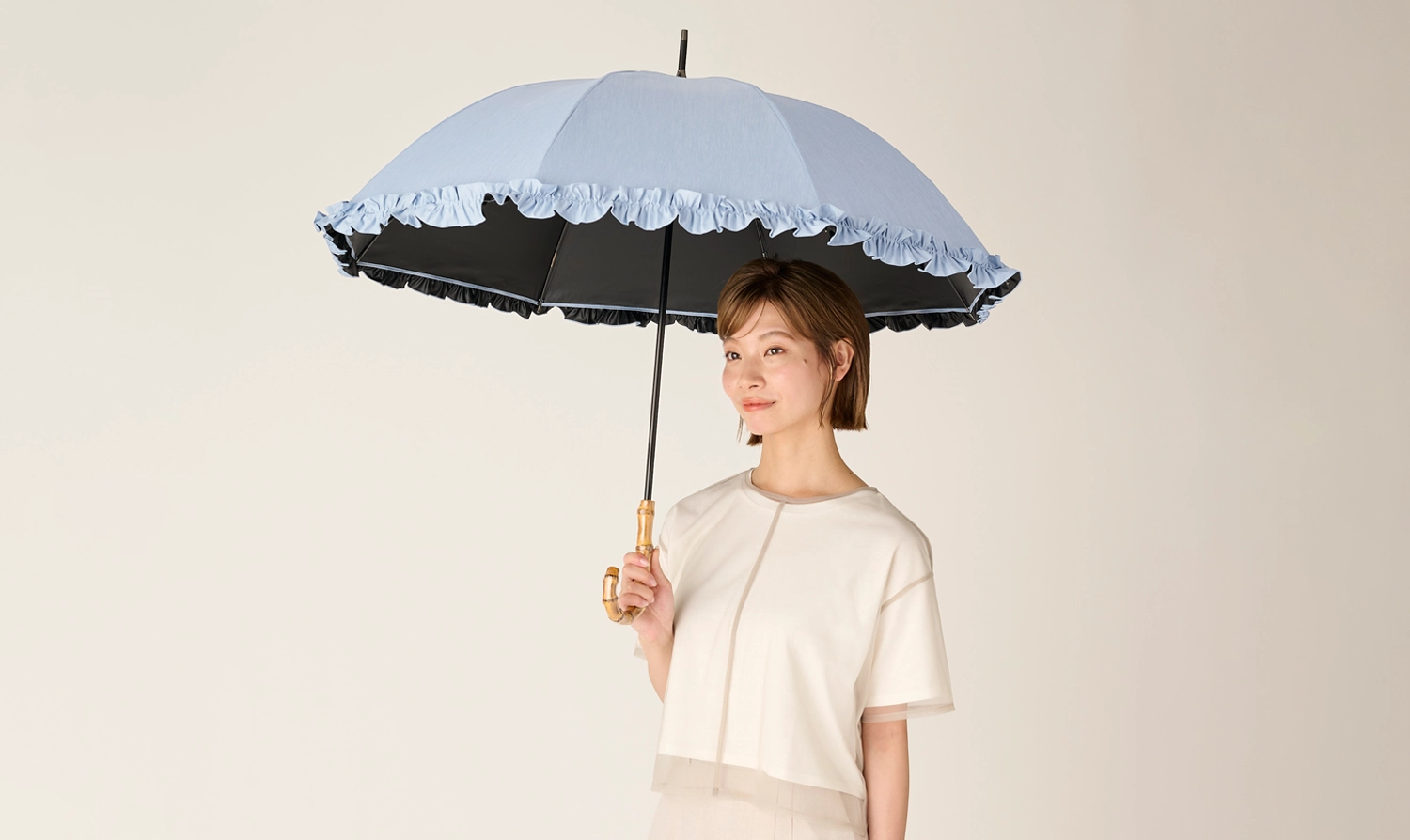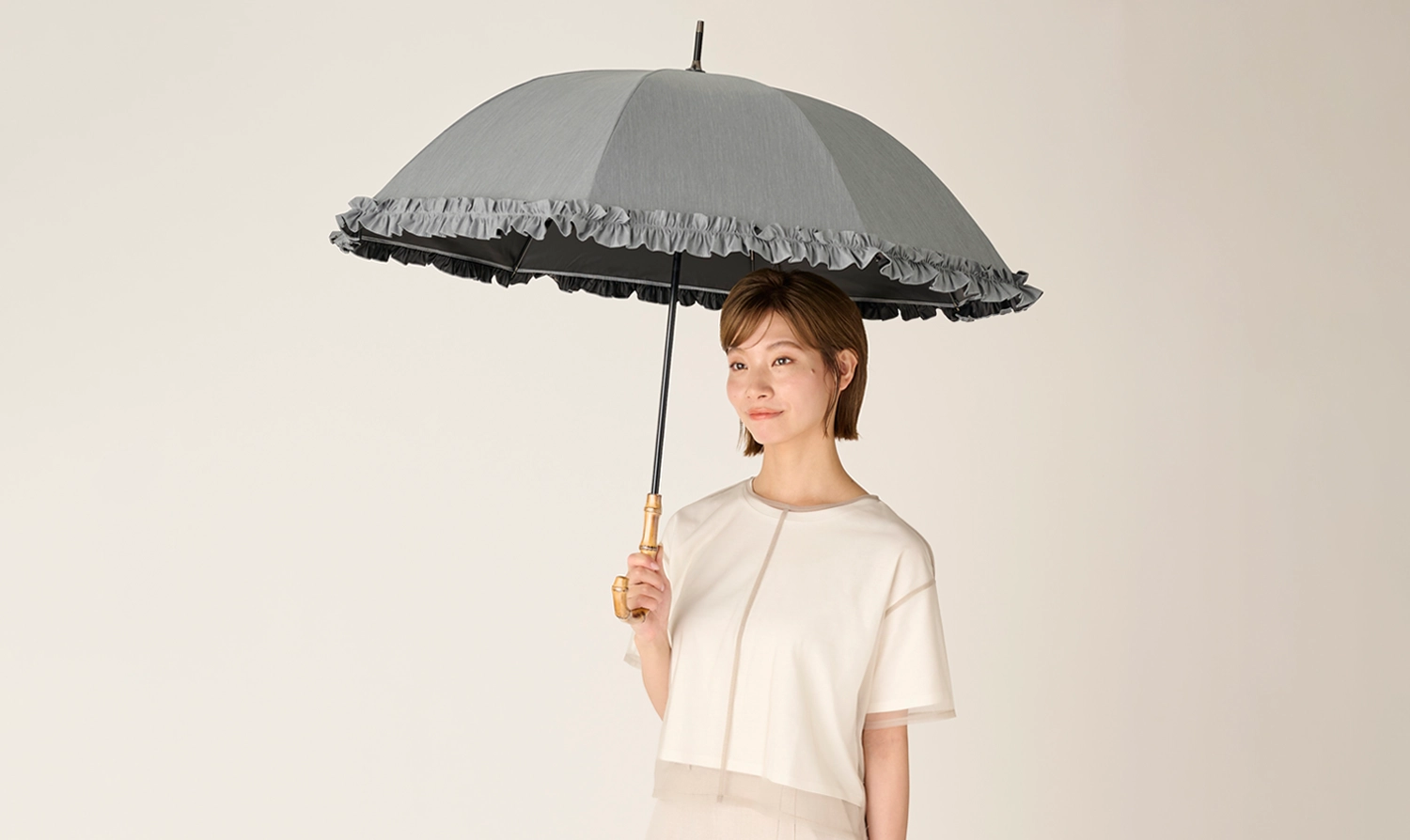 紫外線100%カット、赤外線100%カット、可視光線100%カットの完全遮光日傘です。上品で落ち着いた生地として人気のフロストシリーズです。