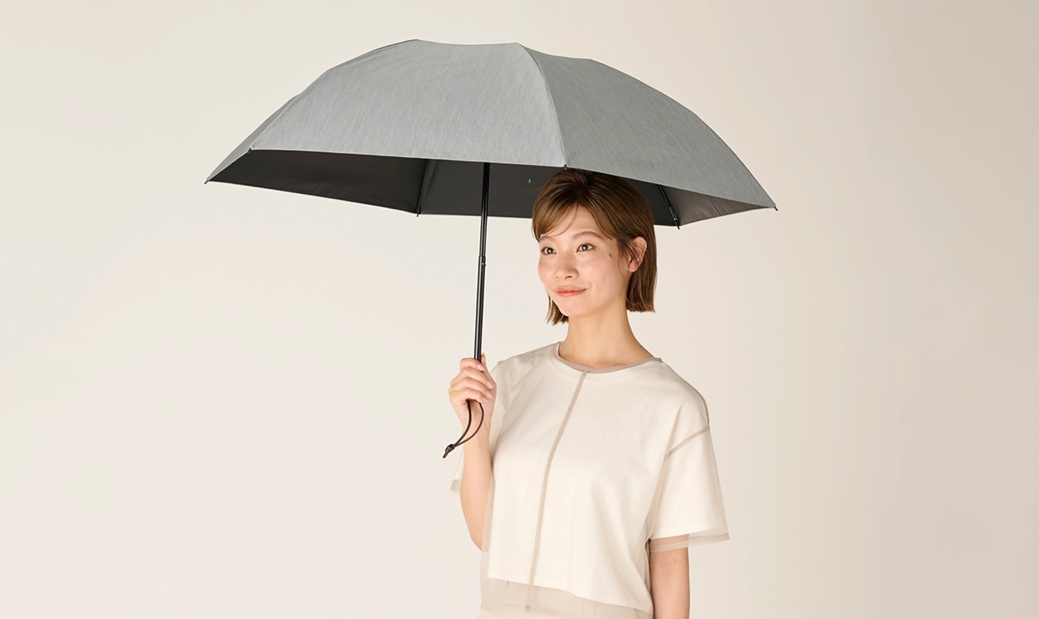 紫外線100%カット、赤外線100%カット、可視光線100%カットの完全遮光日傘です。フロスト(シャンブレー)の上品で落ち着いた生地を使用した、3段折日傘です。男女問わずお使いいただけます。