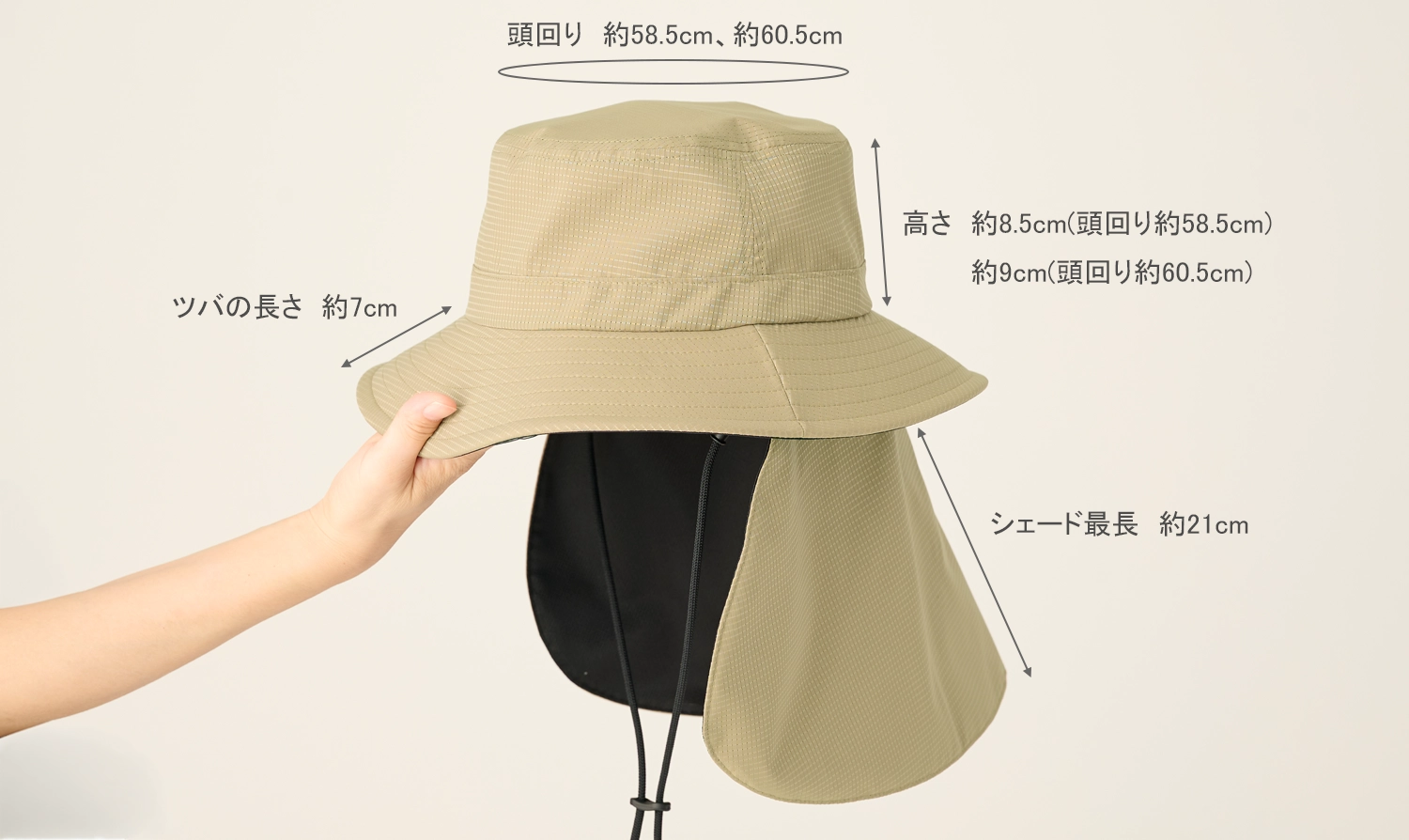 頭周りのサイズは58.5cmと60.5cmの2サイズ展開。
