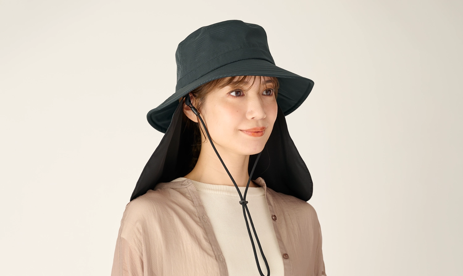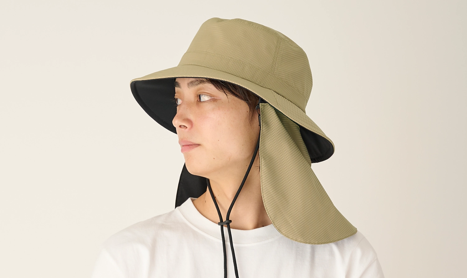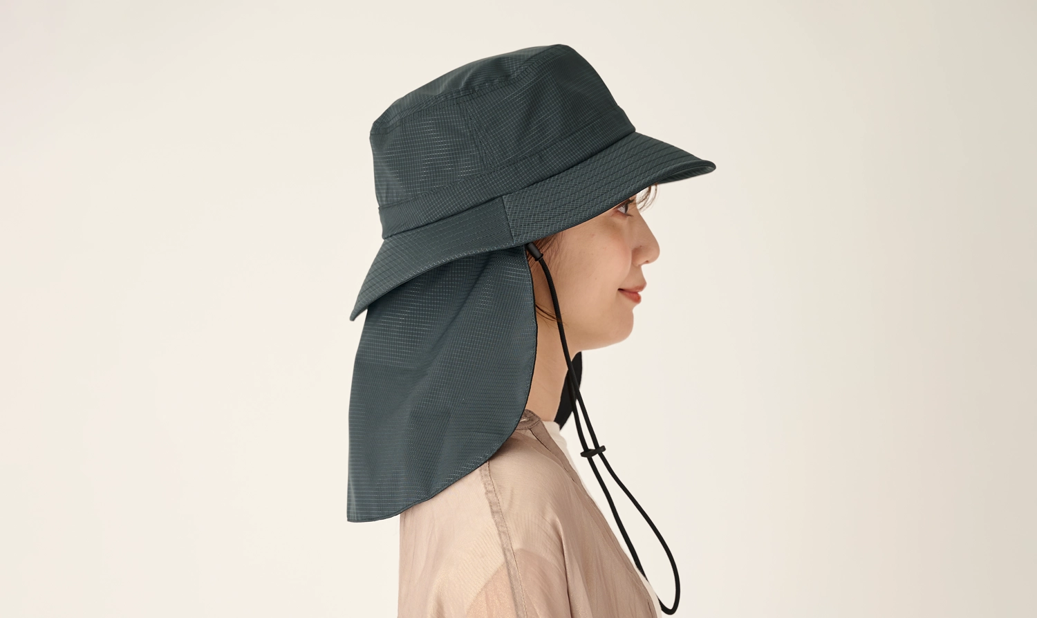 シェード部分は表生地とメッシュの間に完全遮光生地を挟み込んだ「3層構造」。完全遮光のシェードで首周りや耳元を日差しからしっかり守ることができます。