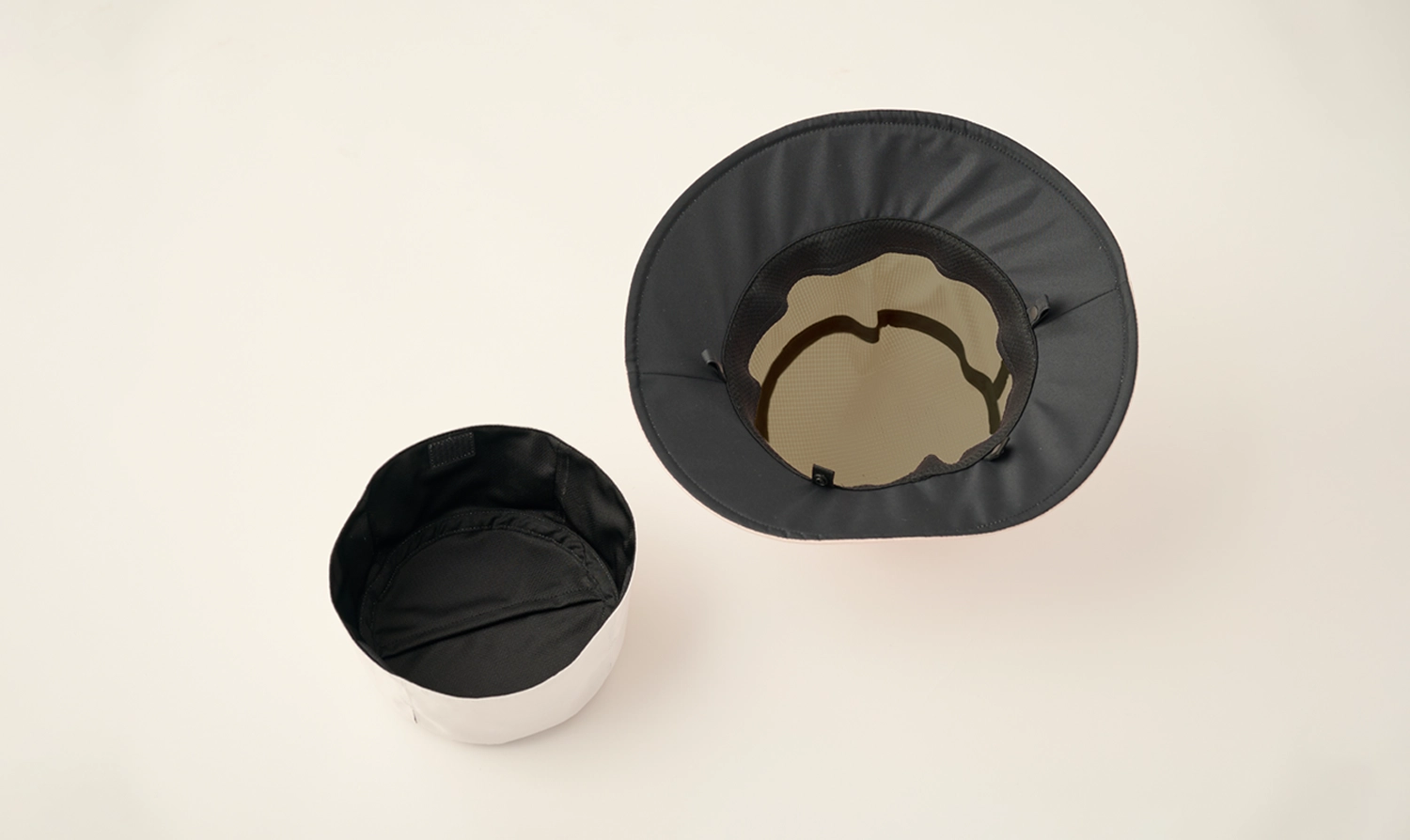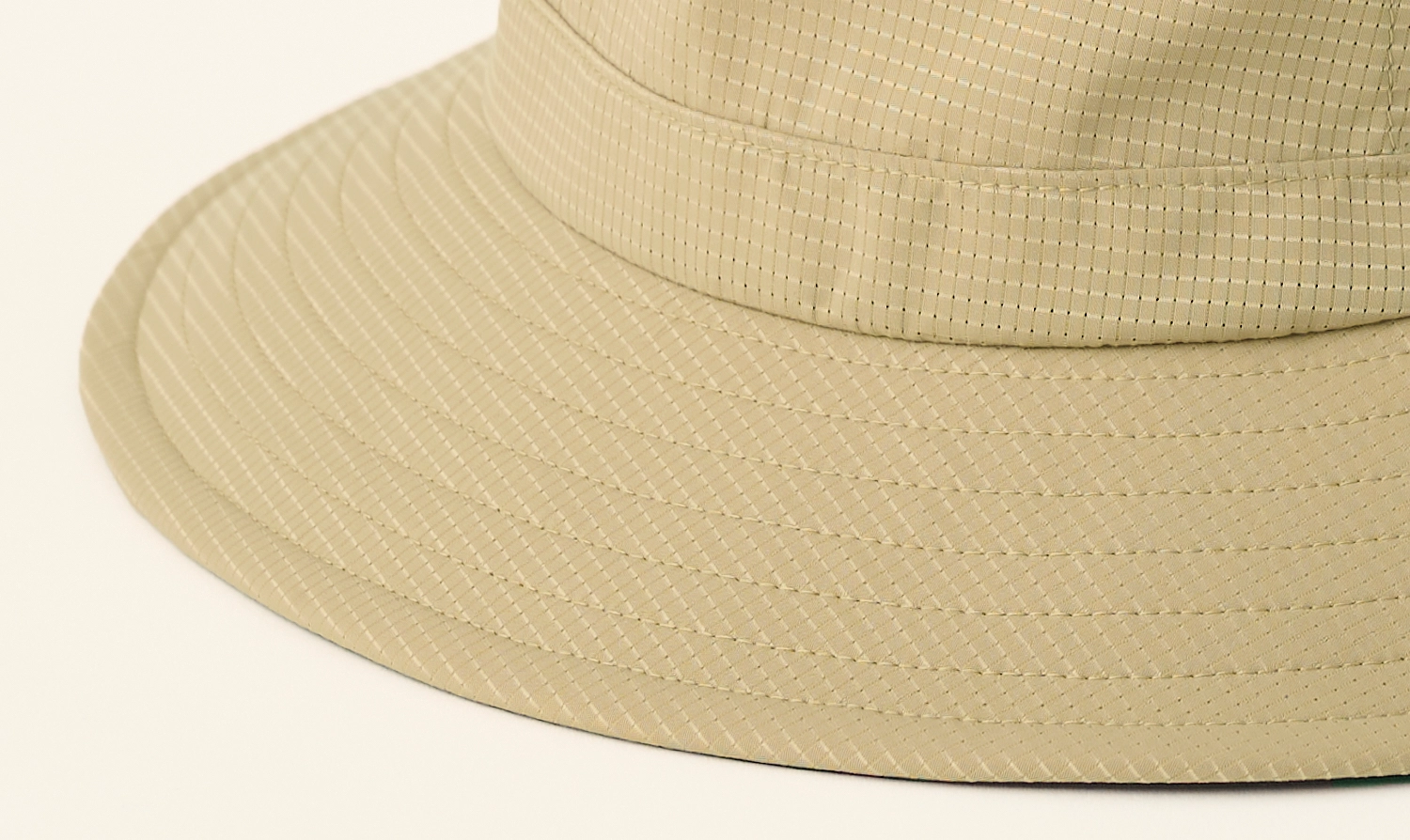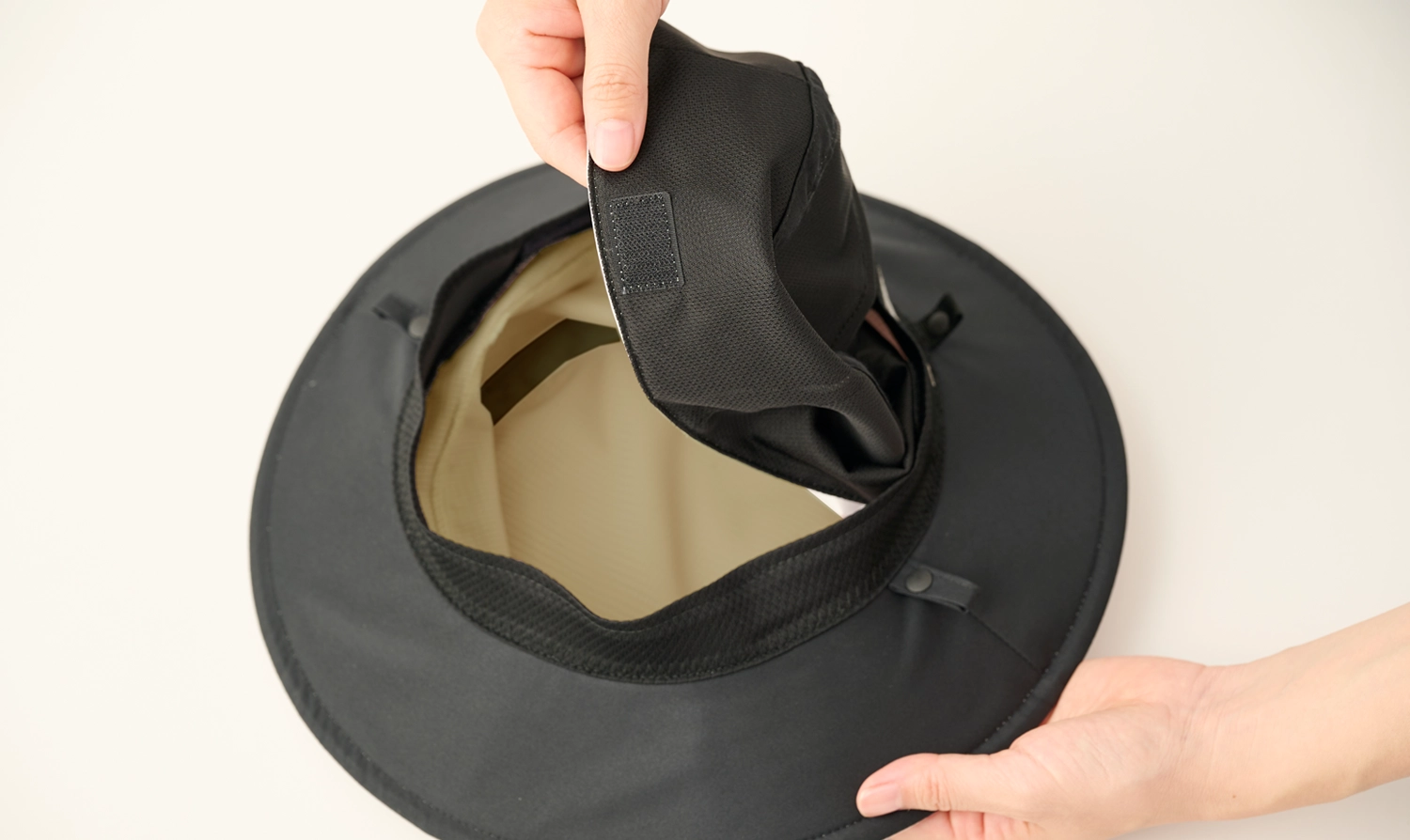 ツバの裏側は光沢を抑えた黒の完全遮光生地、シェードの内側には黒のメッシュ素材を使用。顔に近い部分を黒に統一することで、日光を吸収して反射を防ぎ、まぶしさや目の疲れを大幅に軽減します。